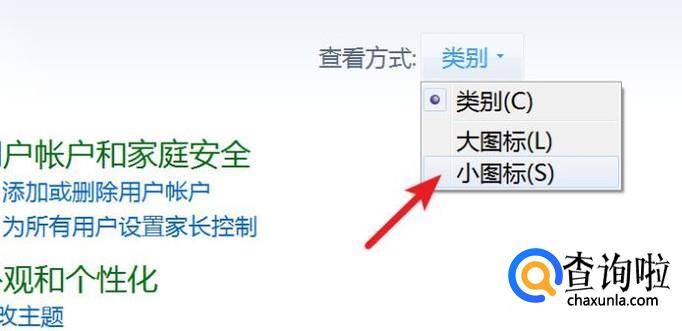 打开控制面板后,点击查看方式的‘小图标’,以显示出所有的选项。