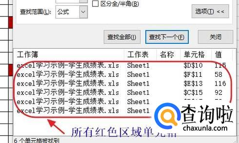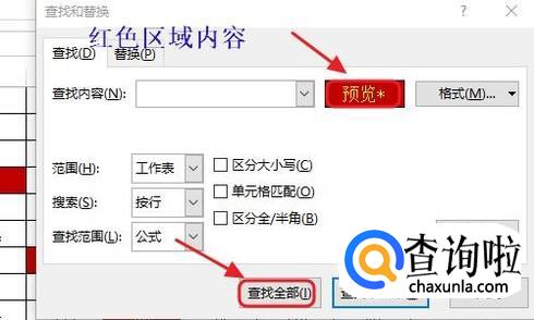此时鼠标就会变成取色器图标了,我们对着任意一个红色背景的单元格点击一下鼠标即可,然后点选对话框的“查找全部”;