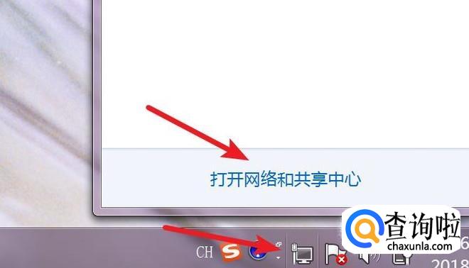 点击任务栏右边的网络图标,然后点击‘打开网络和共享中心’