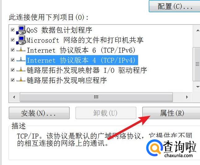 在本地连接的属性窗口,选中ipv4,点击属性