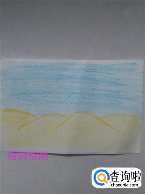 用浅蓝色笔将弧线以上的部分全部涂成浅蓝色,表示蓝蓝的天空,沙漠就画完了。