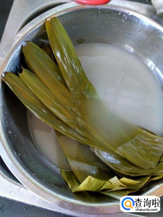 先将粽叶清洗干净,如果是干粽叶需要在开水里煮一下,如果是湿粽叶只需要在水里浸泡1个小时就可以了。