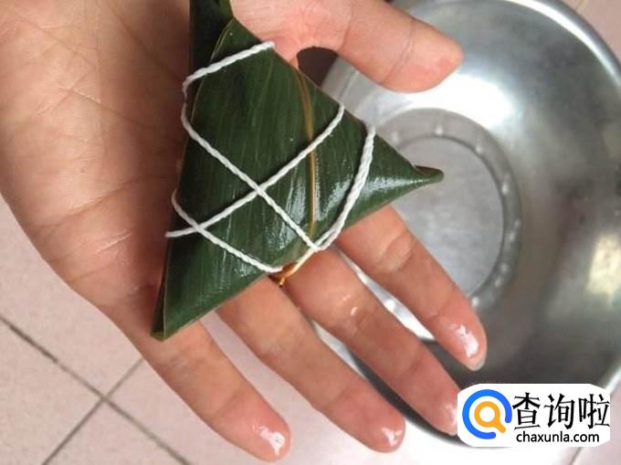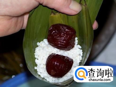 然后放入适量糯米,两粒蜜枣,几粒花生,用剩余的粽叶将糯米盖好,再用绳子固定好就可以了。