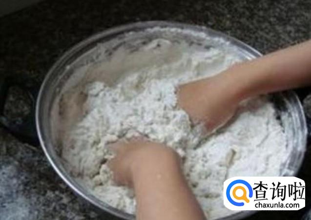 待面粉成为了小疙瘩时,用手捏面粉,将所有小面疙瘩揉成一团