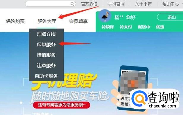 登录成功后我们在官网导航栏目找到“服务大厅”,鼠标移动到服务大厅后会弹出“保单服务”栏目,我们点击进入