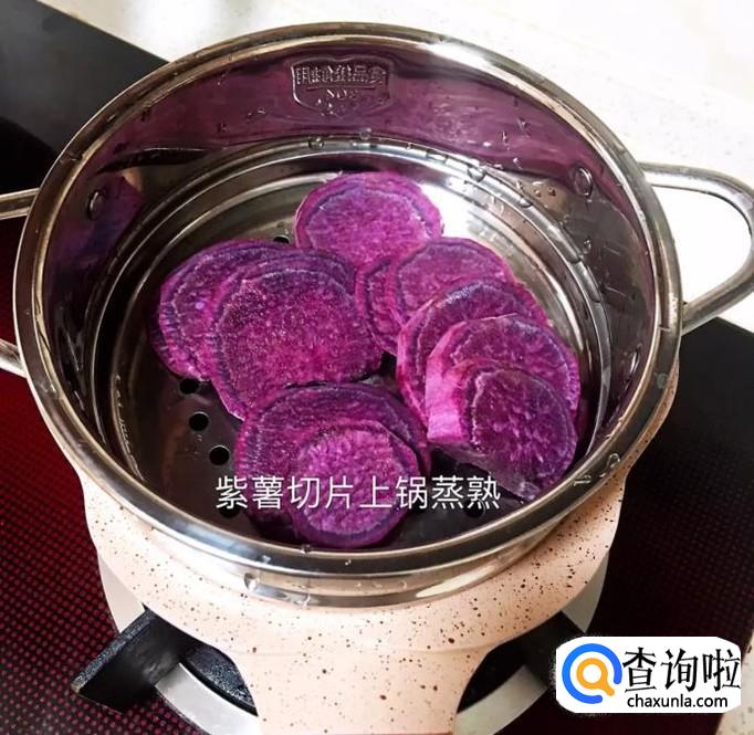 然后把紫薯切片上锅蒸熟,如下图所示。