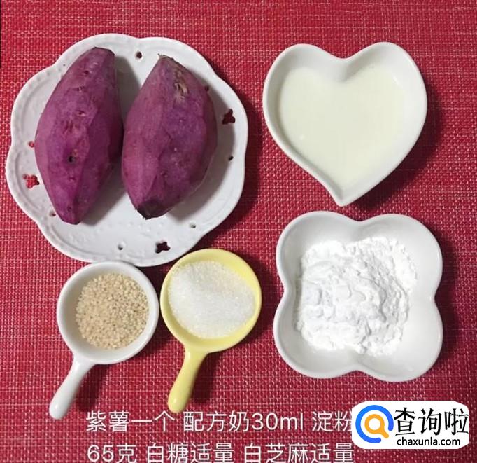 首先准备好所有的食材,如下图所示。小贴士:紫薯一个,配方奶30ml,淀粉65克,白糖适量,白芝麻适量。
