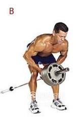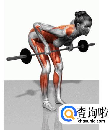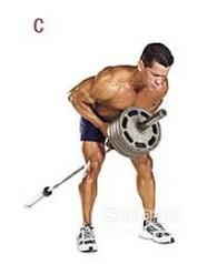 先匀称吸气,然后俯身抓紧杠铃至腹部下部(如果将杠铃拉至胸下部,则重点锻炼背部肌肉上部,也就是大圆肌、菱形肌、斜方肌和三角肌后束),呼气,肘部和肩部都尽力向后拉并带动肩胛骨,收缩背阔肌,吸气并慢慢收回到起始位置。