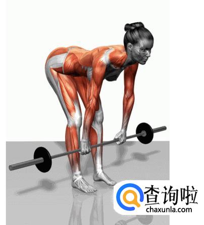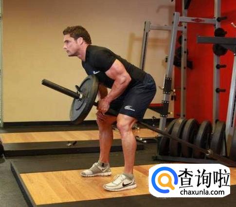 俯身伸髋,双手握住杠铃稍微宽于肩宽,膝盖弯曲身体微微前倾,躯干和地面约成70度左右,如此背阔肌会运动的更剧烈一些,手臂伸直腰部弯曲。