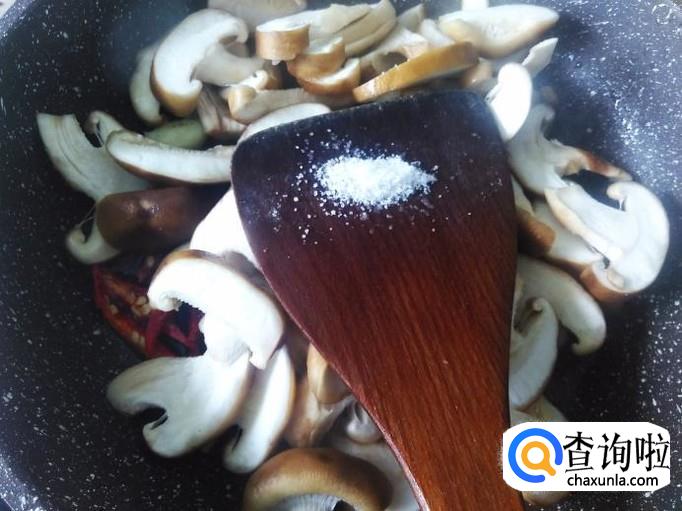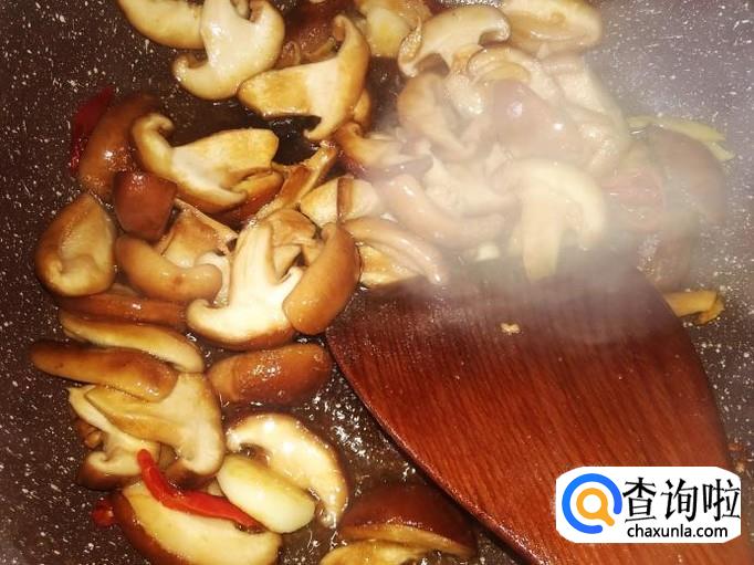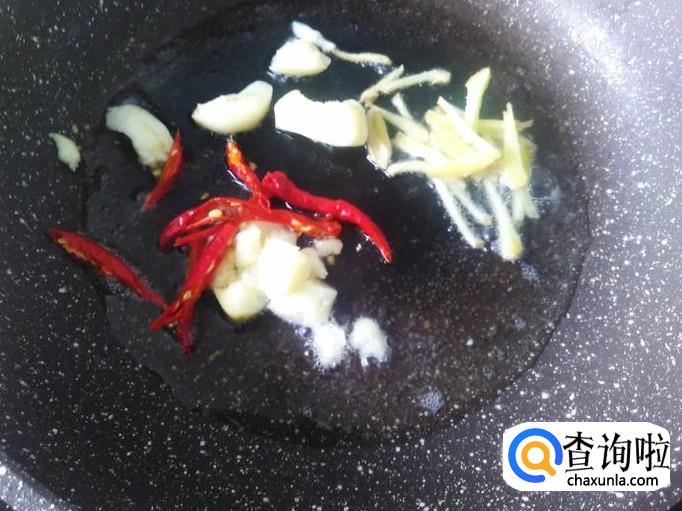 开火下油,放小米辣、蒜米、姜丝进去爆香。【油量要多点,用油爆香菇才好吃】