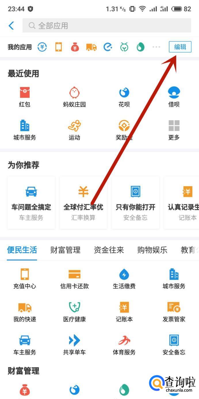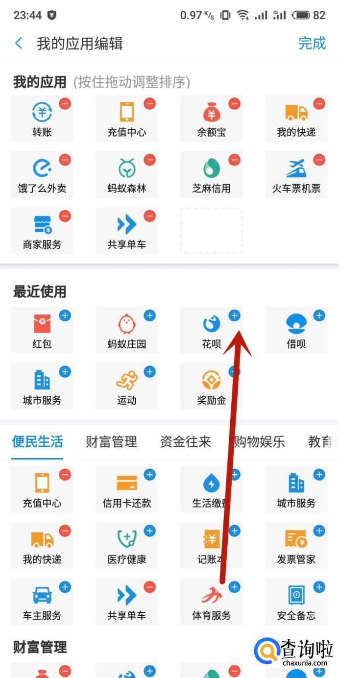 支付宝首页没有花呗选项,需要将花呗添加到我的应用位置即可。以下用安卓系统的支付宝(V10.1.65)操作演示一下。