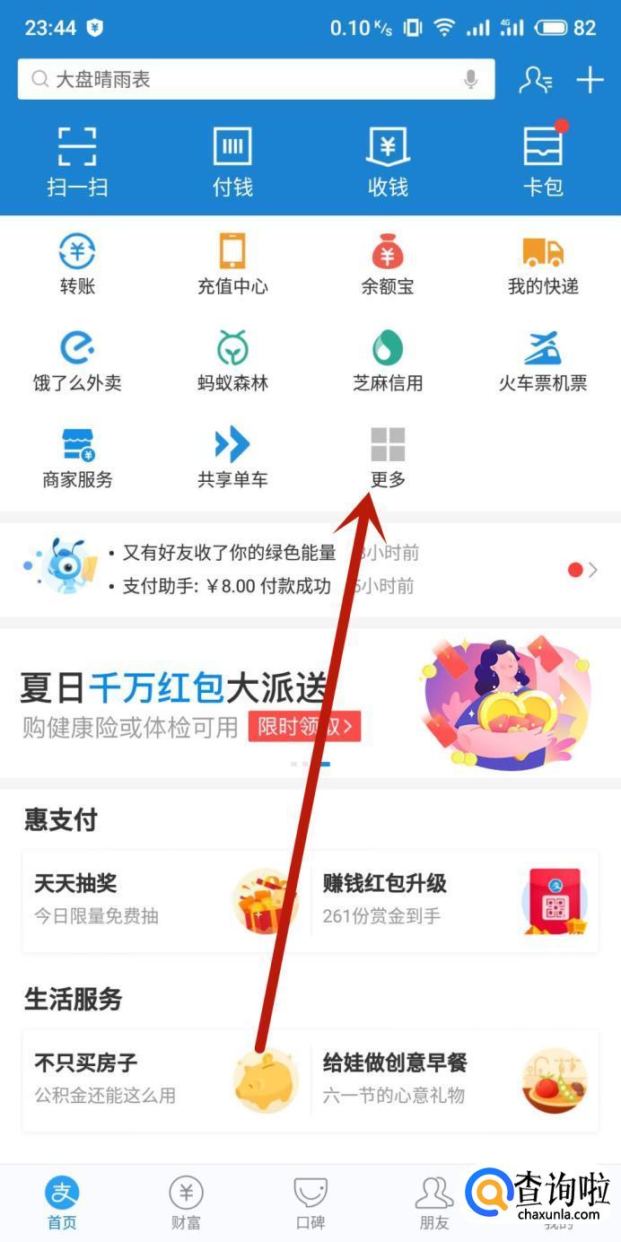 在支付宝首页选择“更多”,如图所示。