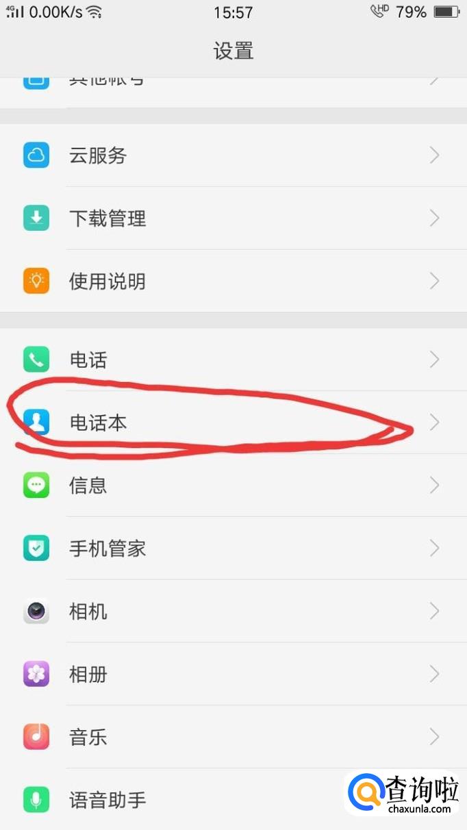配对成功后,下滑设置列表找到电话本。