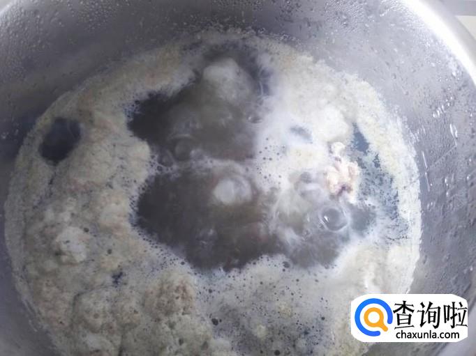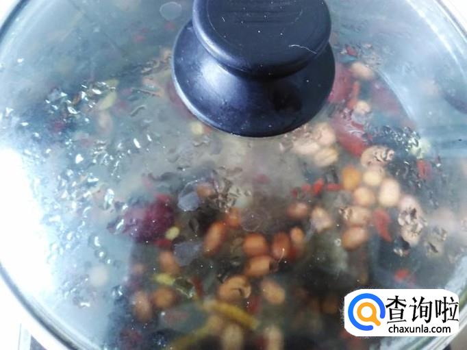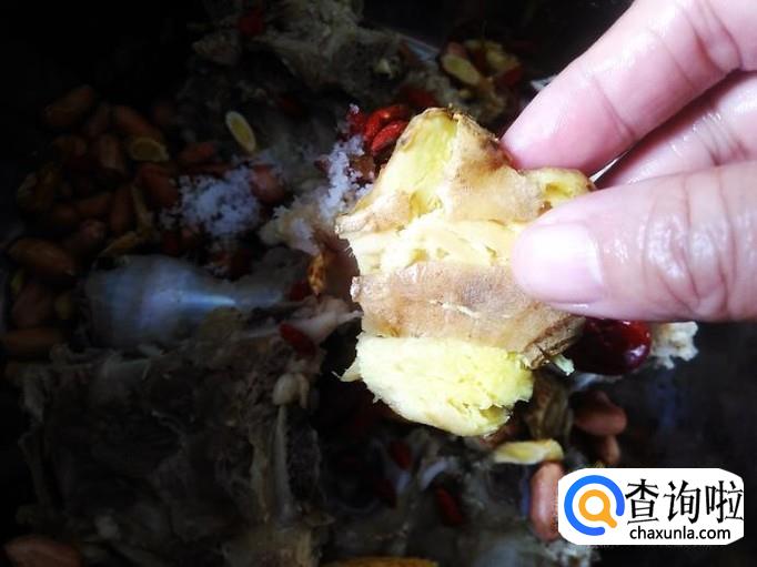 然后把牛骨捞上来放到锅里,再把花生和滋补药材放进去,加适量的盐。