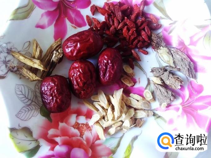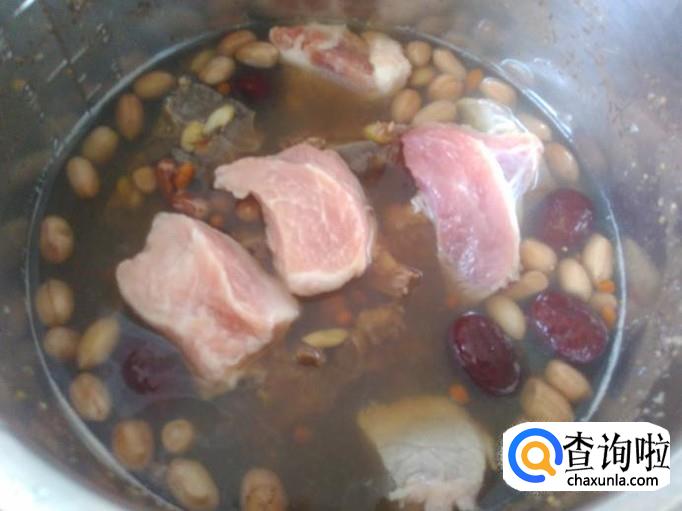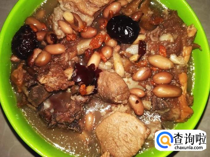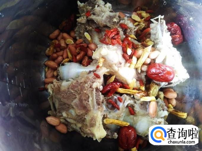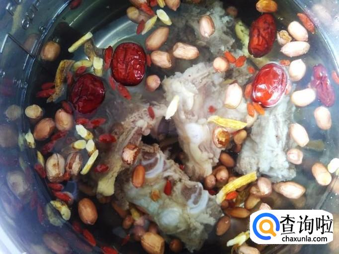 牛排骨500克,瘦肉400克,花生100克,当归、党参、黄芪、枸杞、红枣适量,姜块、黄酒适量。
