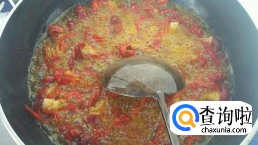 往锅中加水,煮开后,放入盆中炸制备用的小龙虾,不停上下翻炒小龙虾。