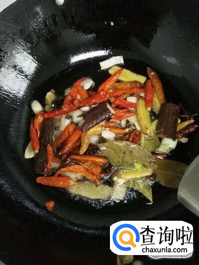 往热油锅中放入葱、姜、蒜、花椒、辣椒、香料等,热油煸炒出来香味即可。