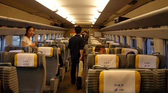 一等座可向后调整椅背的倾斜度比二等座大。卫生间宽敞明亮,有残疾人专用。座位有电动脚托,液晶显示屏,免费lPAD使用,免费饮料零食等。二等座可向后调整椅背的倾斜度大约45度,每个座位后有一个小餐桌餐。新型列车每排有两个充电插座,老式的列车只有车厢前面和后面有,卫生间相对窄。