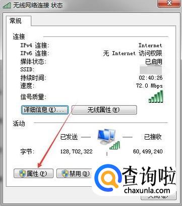 这时会弹出【网络连接状态】对话框,接着再次点击对话框中的【属性】。