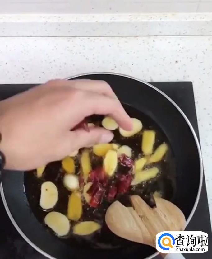 接着我们在锅中倒入适量的黑麻油,放入姜蒜,干辣椒爆香