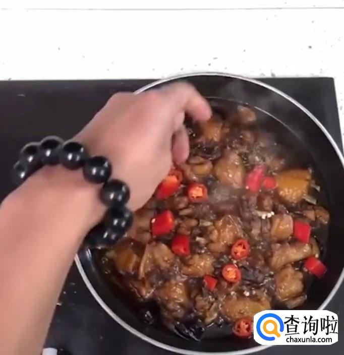 然后我们用大火收汁,再放入适量的冰糖,撒上一些小米辣