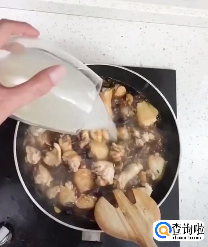 接着我们再放入葱段,适量的酱油,放入鸡肉,倒入适量的台湾米酒开小火炖30分钟