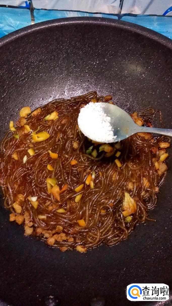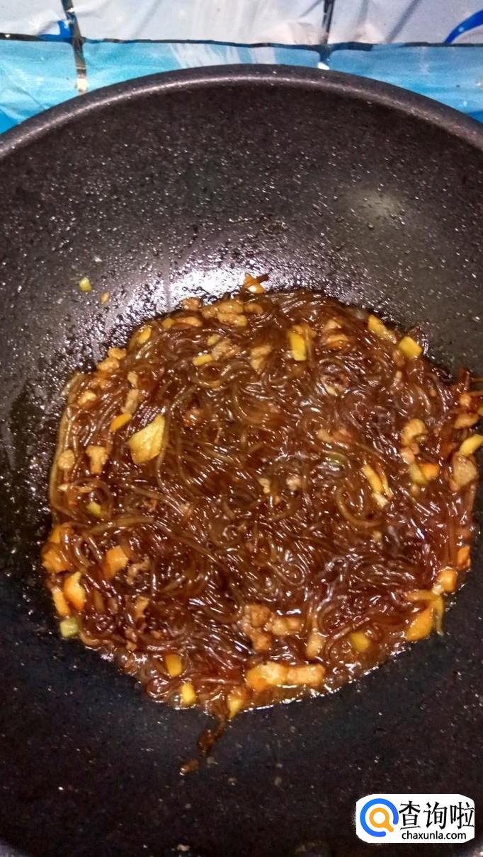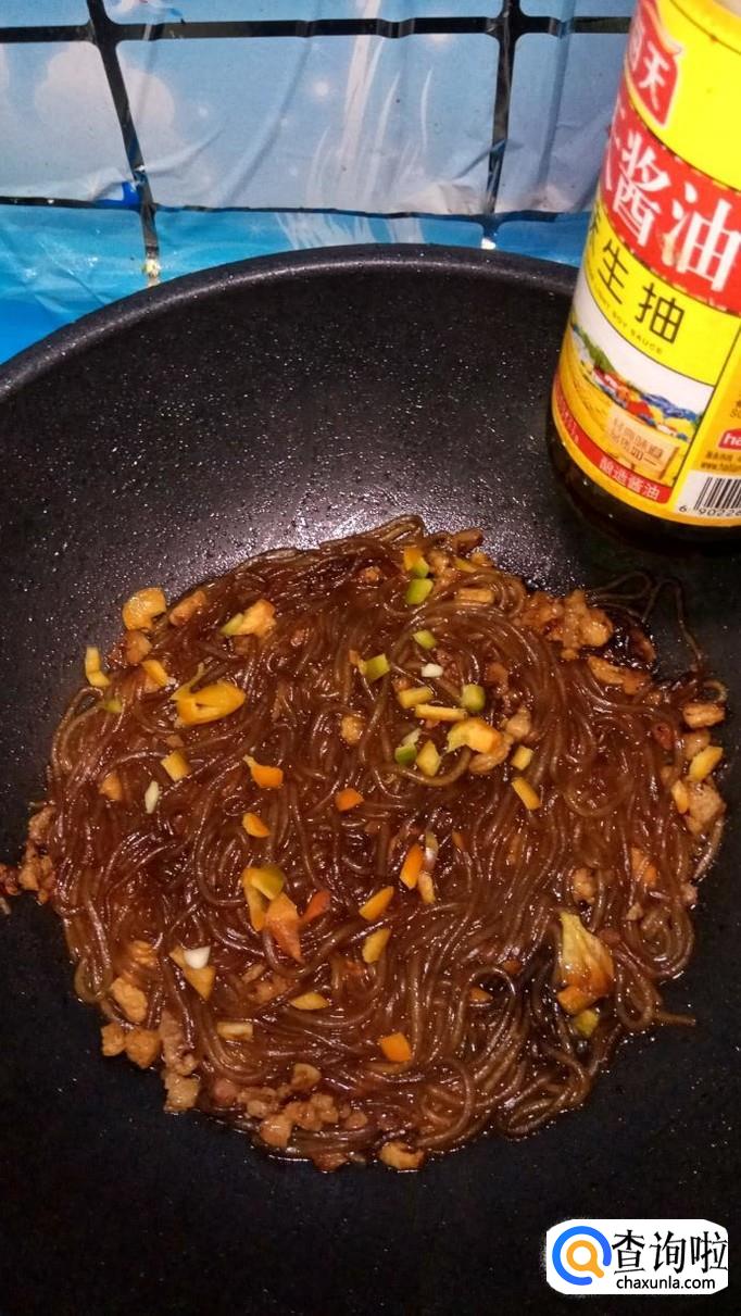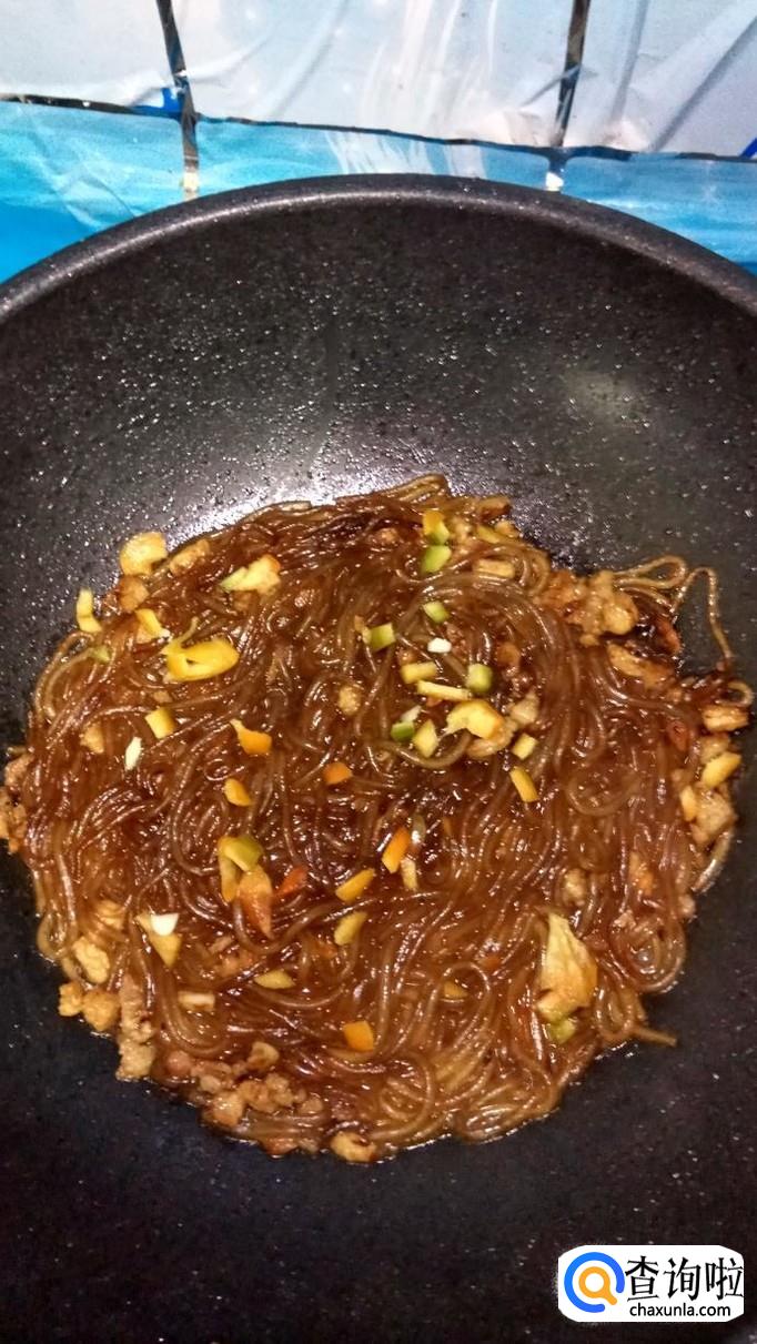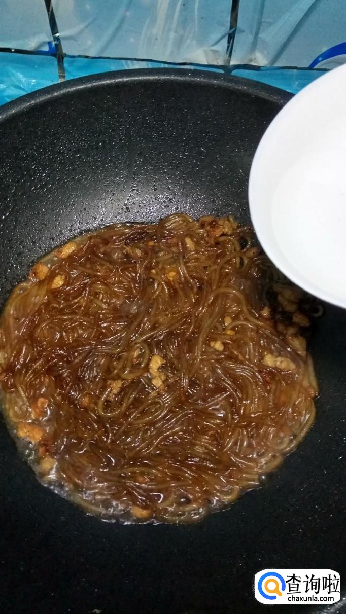 刚泡好的粉丝倒入锅中,和肉末一起翻炒,然后加入100克左右的清水。