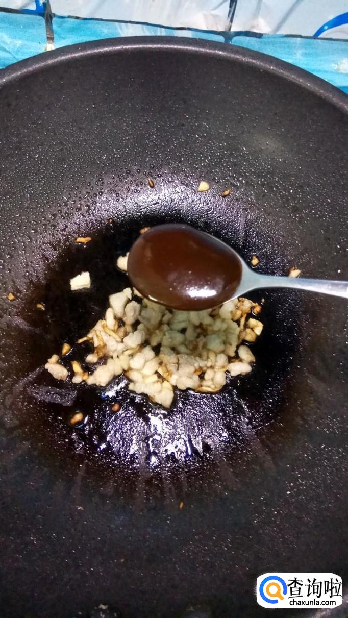 放一勺豆瓣酱,也可以用甜面酱代替,将甜面酱和五花肉一起炒香。