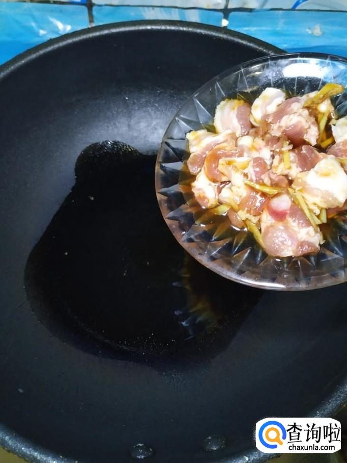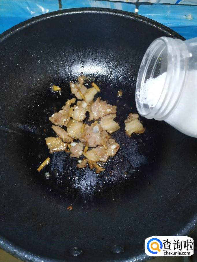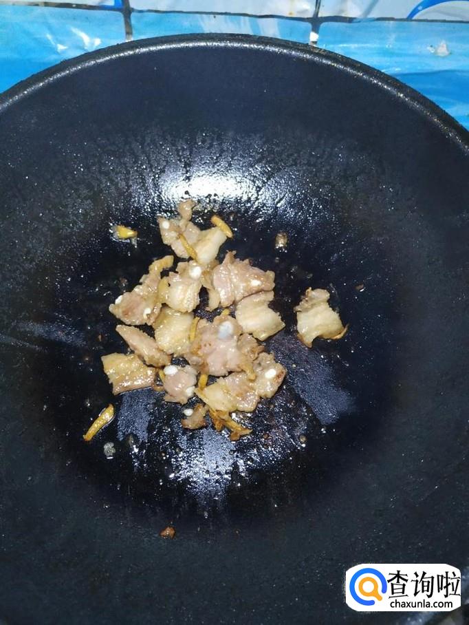 炒锅中放入适量油,油热后,将五花肉片倒入锅中,翻炒均匀,还可以加入适量白砂糖,增亮色泽。炒好之后,出锅装盘备用。