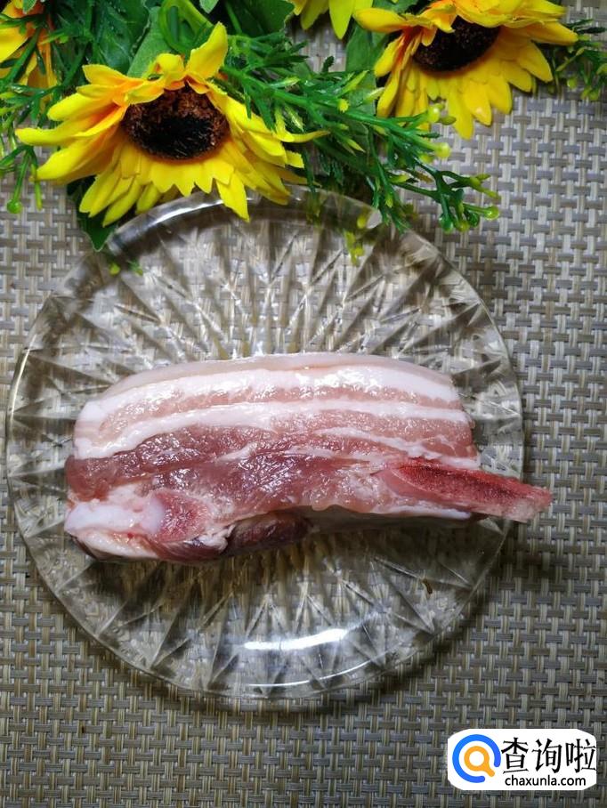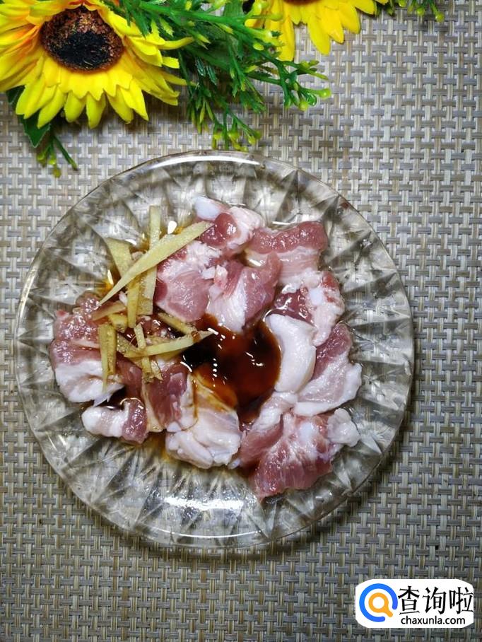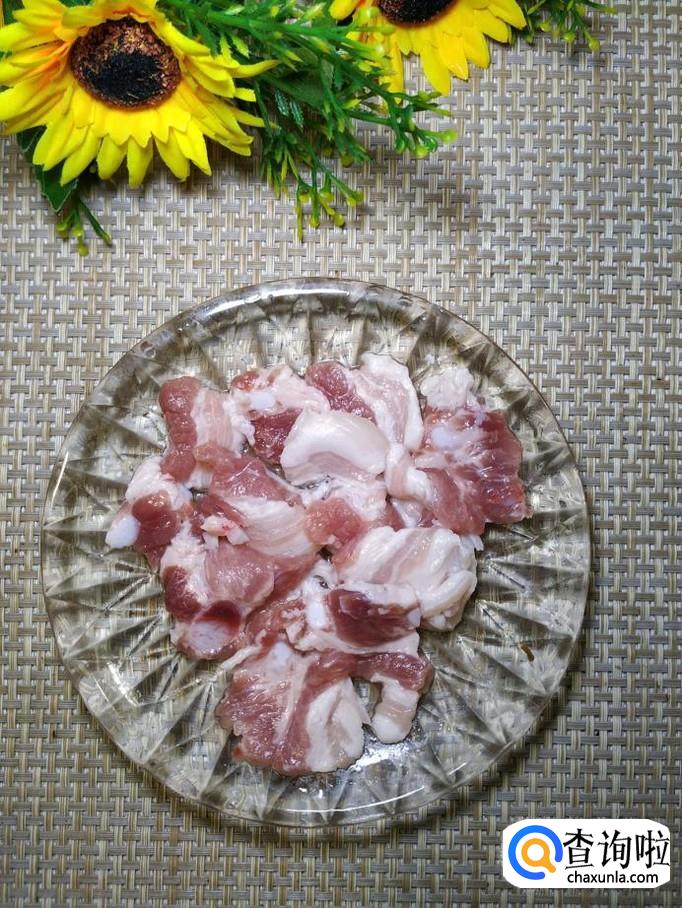 准备适量五花肉,洗净后切成片,放入盘中备用,这种肥瘦相间的肉,炒菜特别好吃。