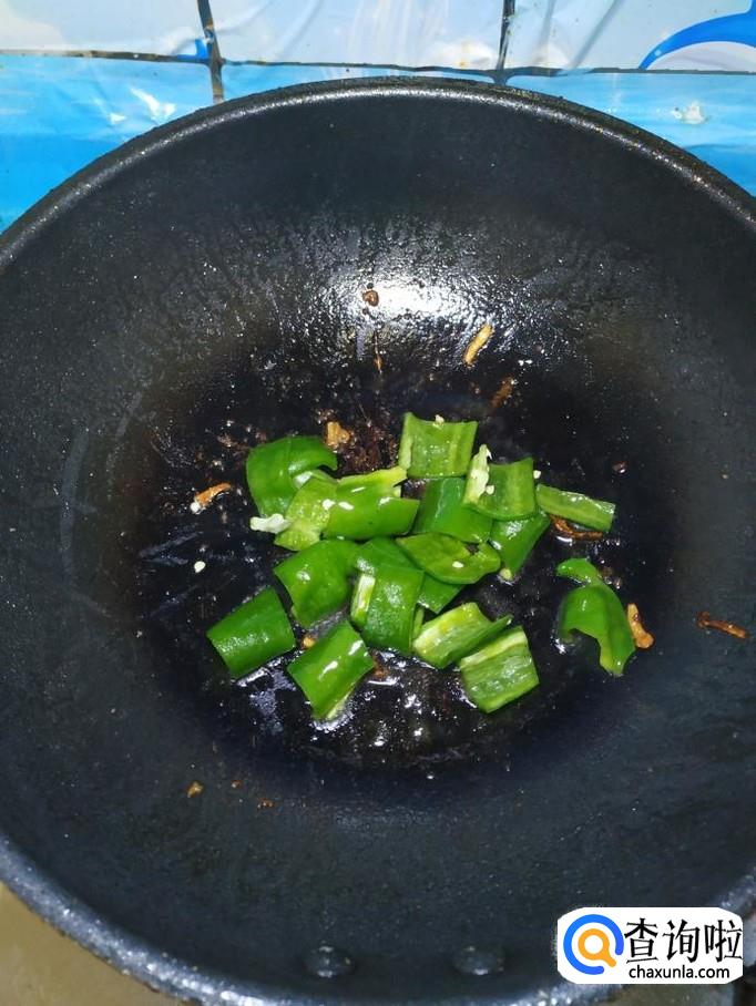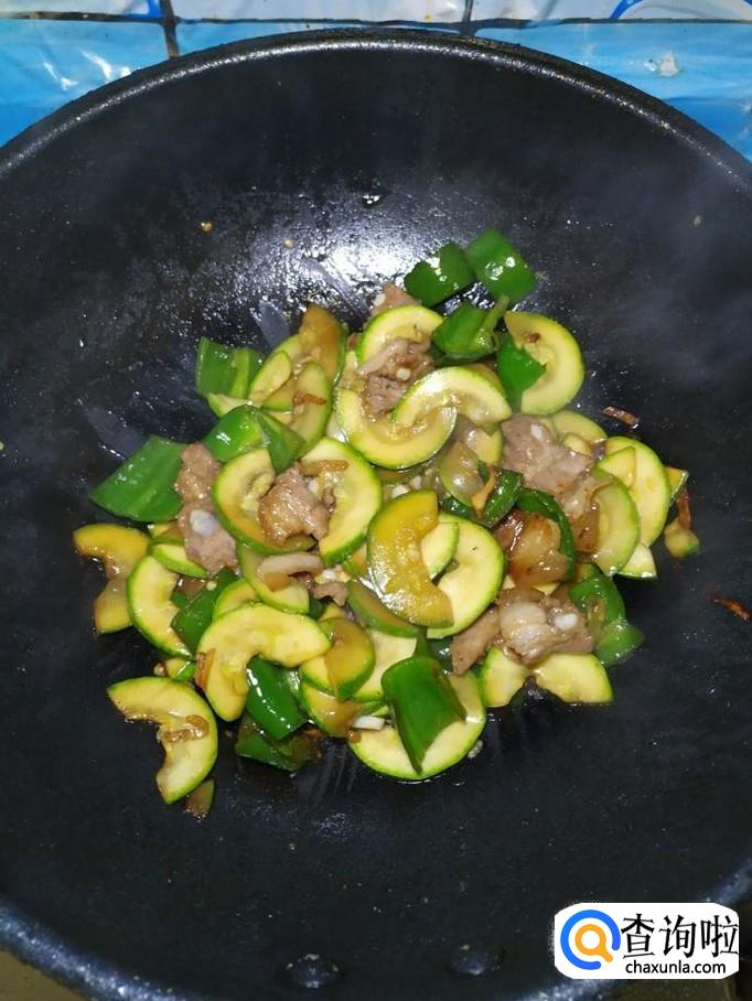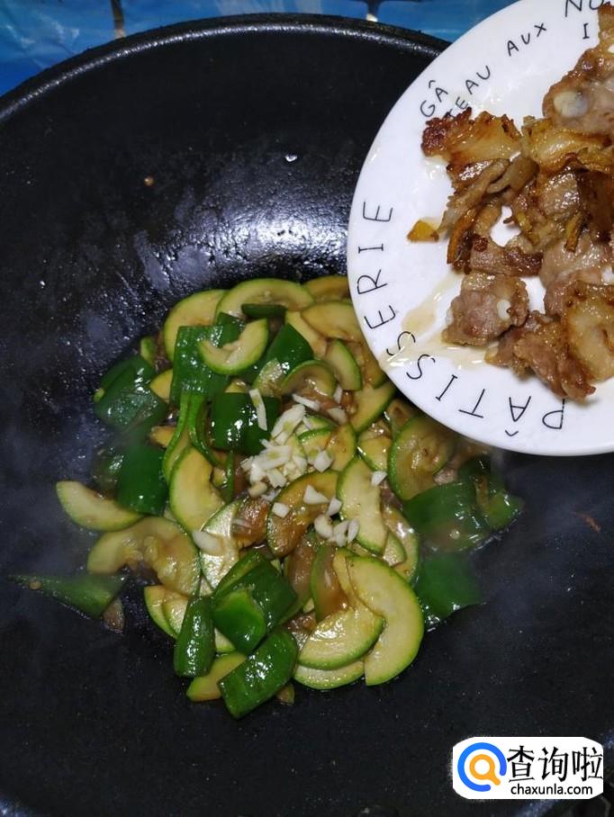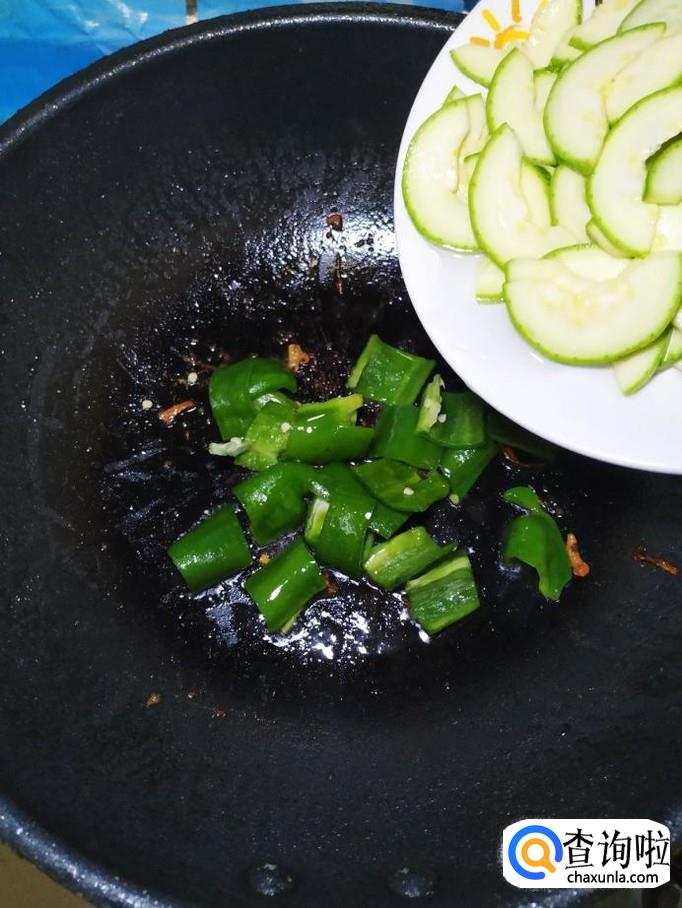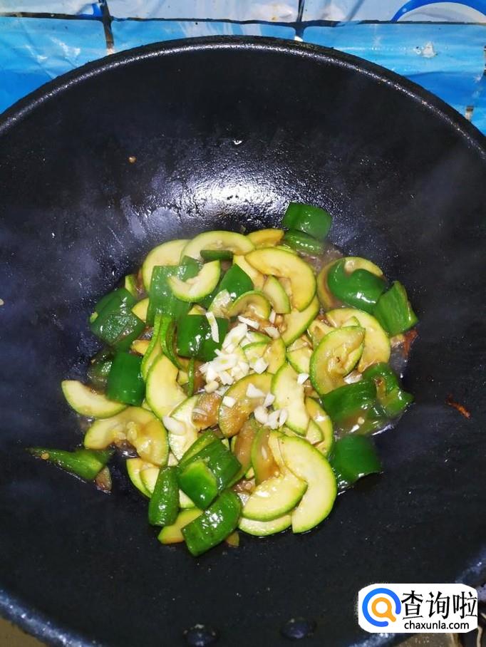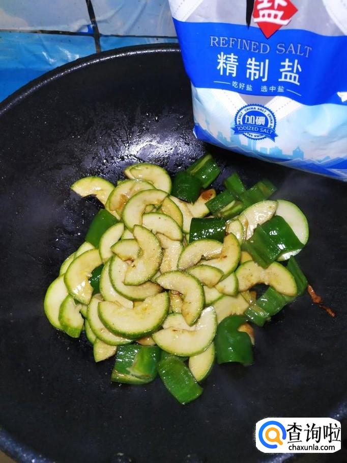 炒锅中再放入适量油,油热后,将青椒倒入锅中炒香,然后将处理好的西葫芦倒入锅中,翻炒均匀。