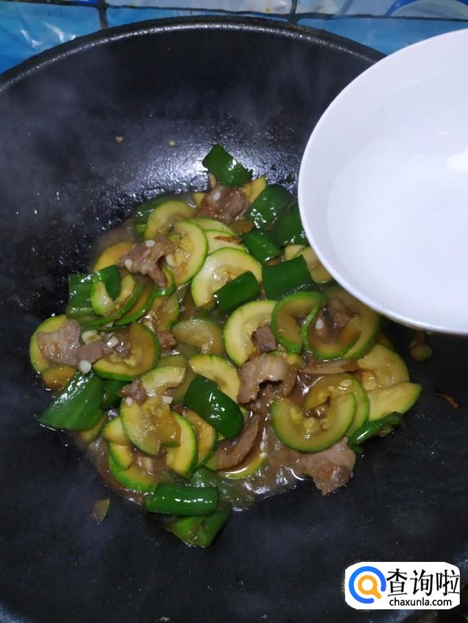 将之前炒好的肉片倒入锅中,和西葫芦,青椒一起翻炒均匀。