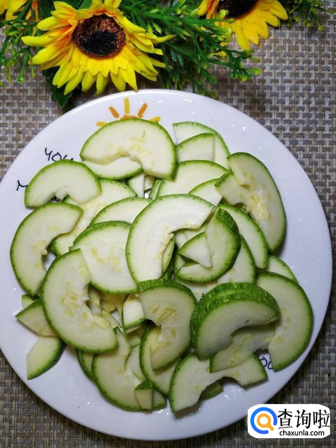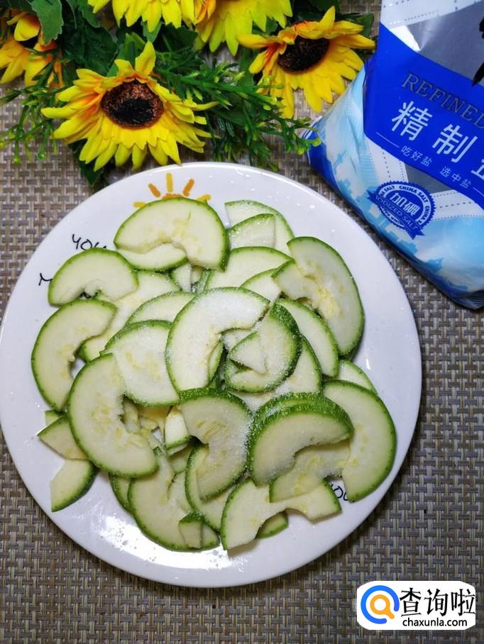 准备适量西葫芦,洗净后,对半切开,挖去内瓤,切成片,再撒上适量食盐,腌一会,用清水洗去盐分备用,这样处理过的西葫芦,口感更有韧性,不容易碎。