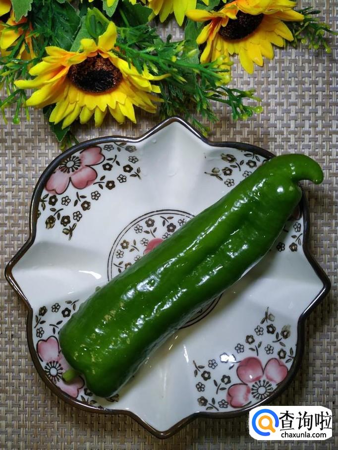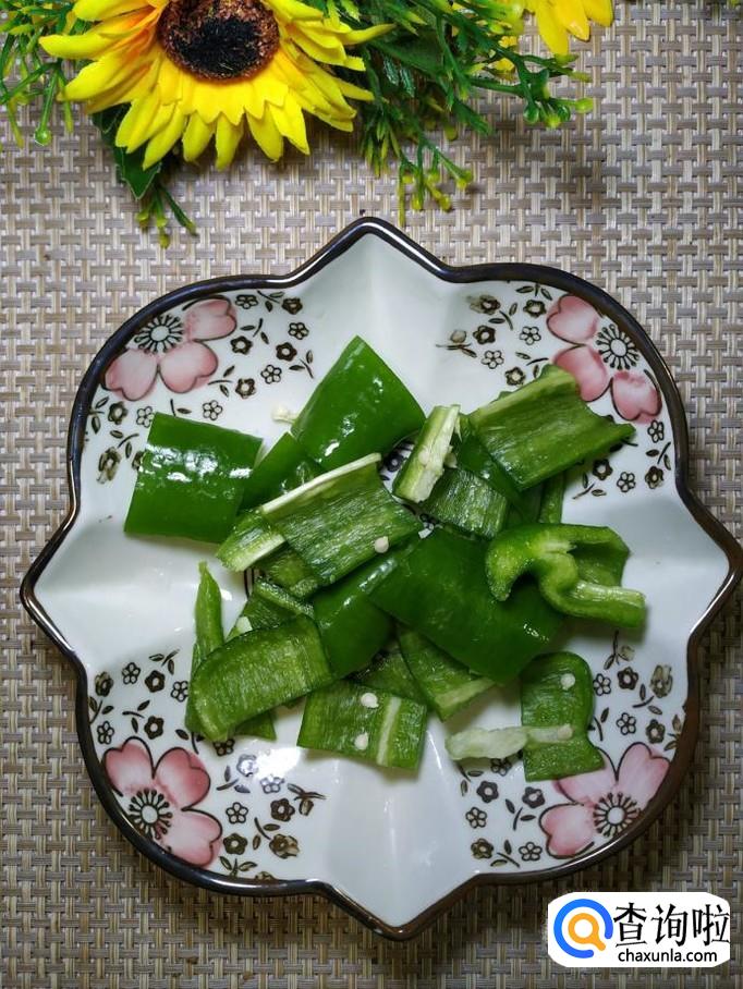 准备适量青椒,洗净后,切成片,放入盘中备用。