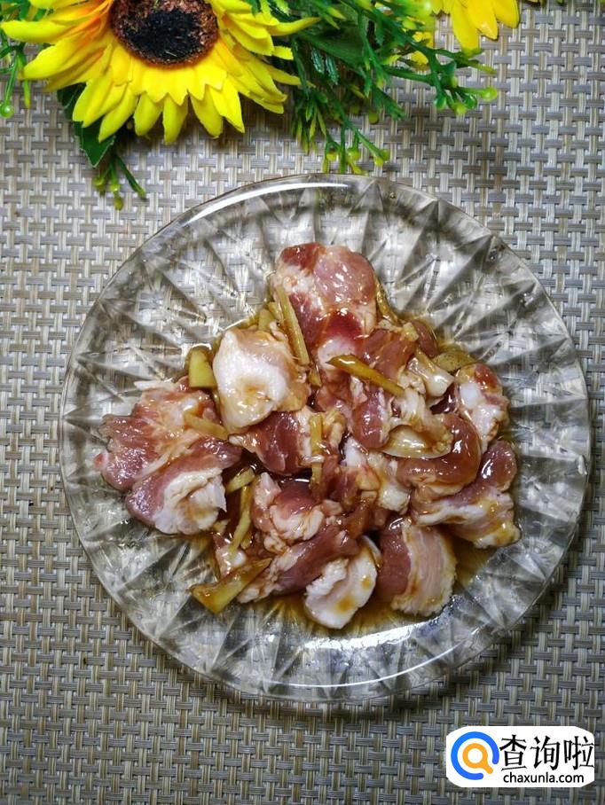 准备适量姜,洗净后切成丝,放在盘中再放入适量鸡精,五香粉,生抽,蚝油,料酒,搅拌均匀,腌制15分钟。