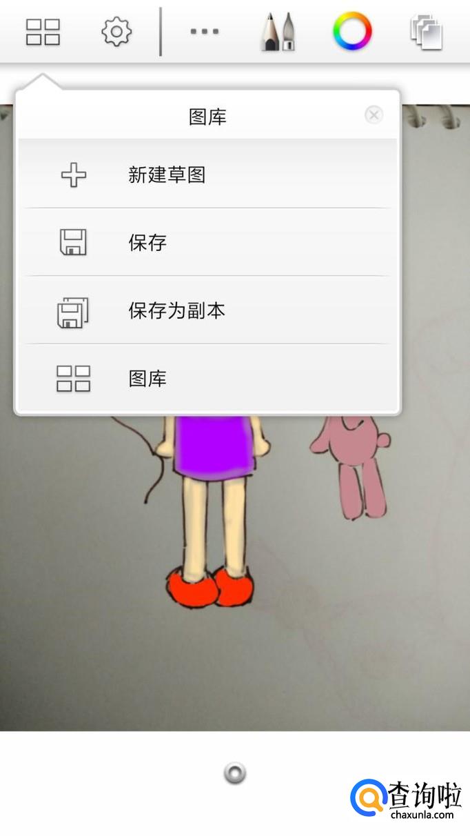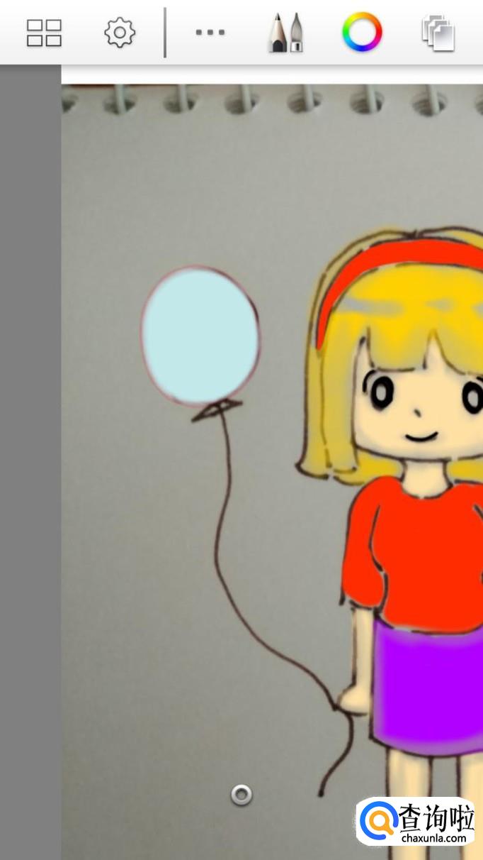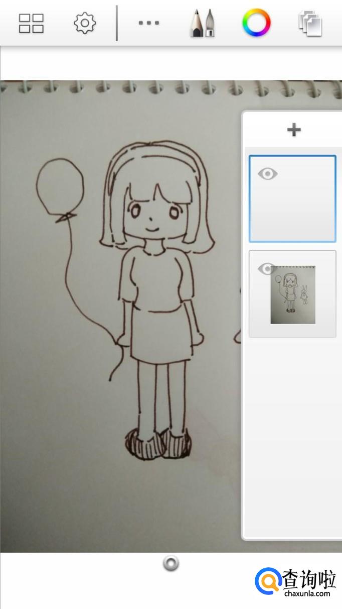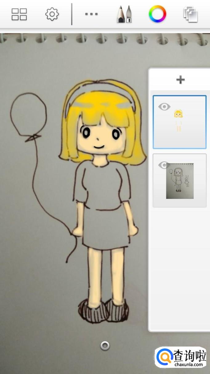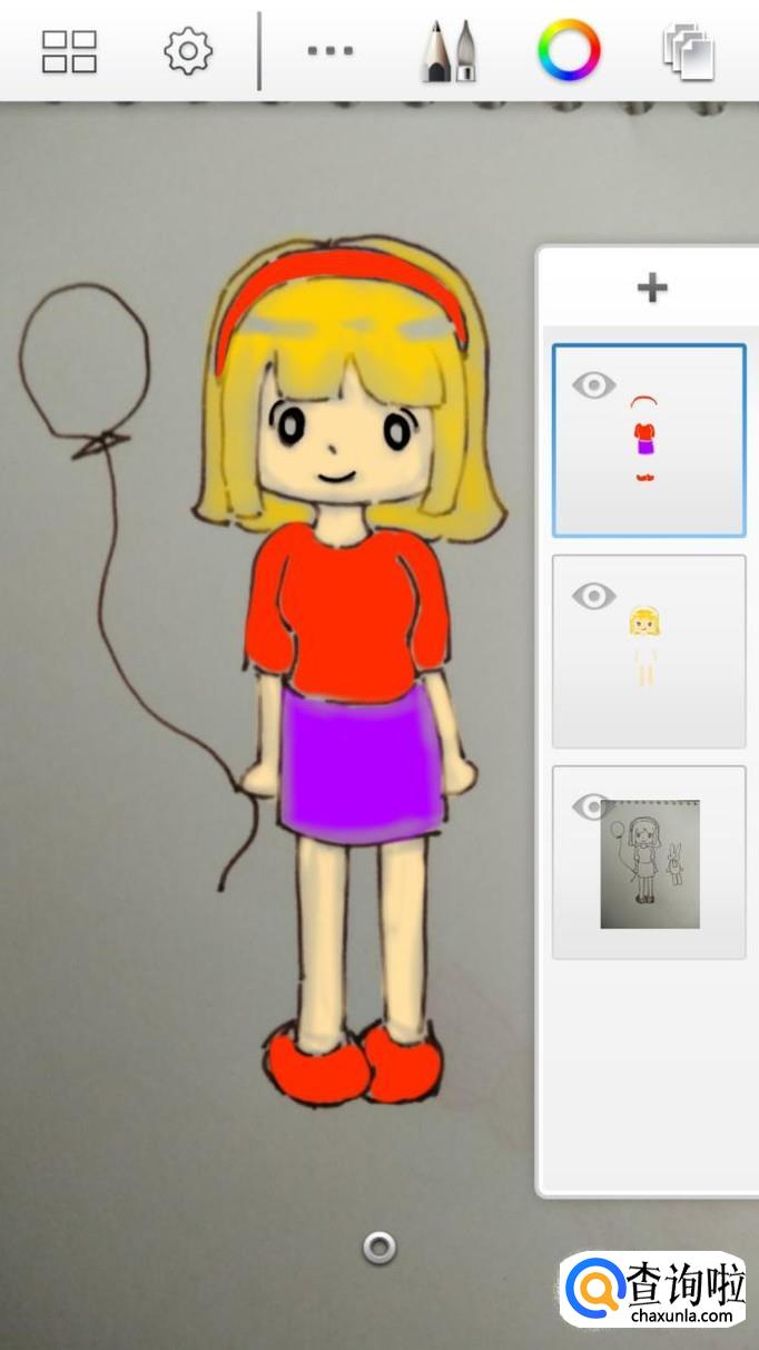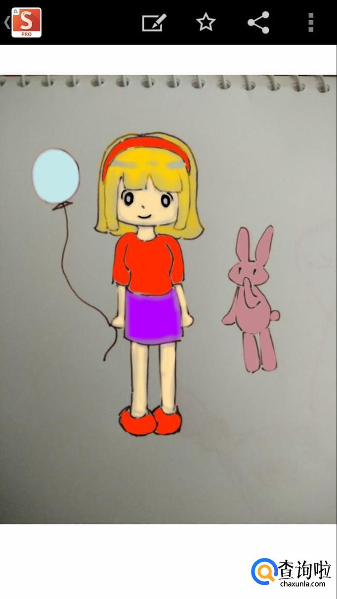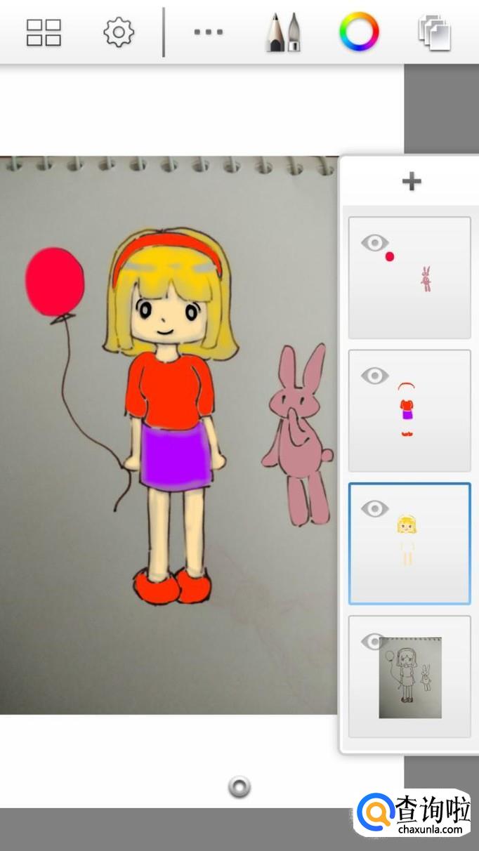 最后,我们只需要再添加第三个图层,然后选用玫红和浅粉色,来为人物手上的气球,以及其身边的小兔子涂好颜色就可以了。画好后我们还可以点击左上角的图标,将作品保存在手机相册中,这样就不怕完成的作品丢失了。