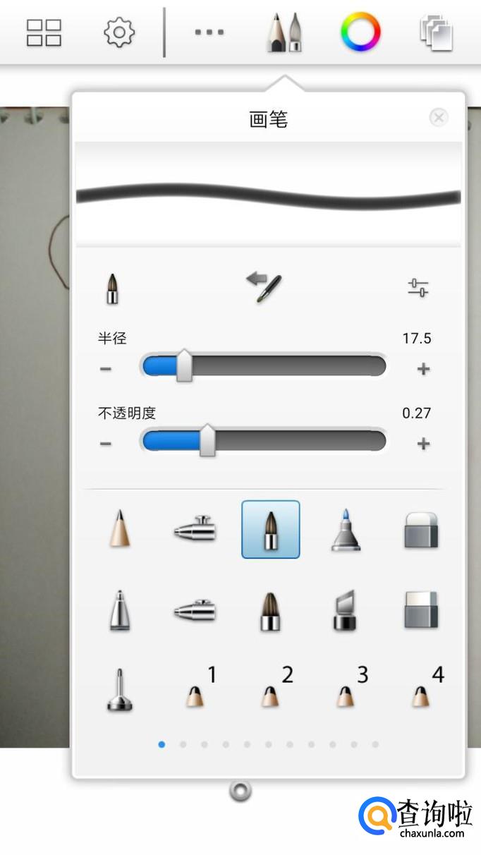 接着,我们需要点击上方边栏中的画笔图标,选择自己喜欢的画笔类型,并适当调整画笔粗细和透明度,然后再点击画笔旁边的调色盘图标,选择自己喜欢的颜色。