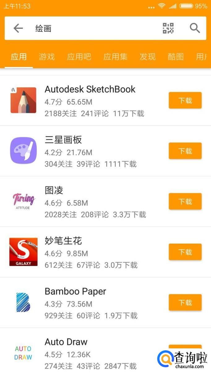 首先,我们要打开手机上的应用商店,在最上方的搜索栏中,输入“绘画”这个关键词并点击搜索,就可以看到有很多可用于绘画的app了,我们要在其中寻找并下载可以插入图片、可以添加图层的绘画app,例如:妙笔生花、medibang、三星画板等等。