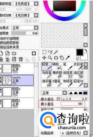 那么,我们在这里先看一下自己的sai,检查一下最小直径的大小,如果数值是100%的话,就说明是没有压感的,将之调为0,效果就回来了。