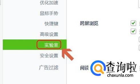 首先点击游览器右上角的“工具”-“选项”,然后在选项界面的最左侧找到“实验室”,如图二所示...