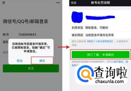 登录后弹窗提示将告知该帐号被封情况,点击确定申请激活,了解帐号被封具体原因,点击我已了解申请解封。