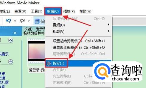 我们必须点击缩列图上方的播放按钮,才能进行视频剪辑哦,这一点很关键!视频处于播放状态的时候,我们点击软件上方的工具栏“编辑”-“拆分”,这样可以快速给视频进行剪辑...