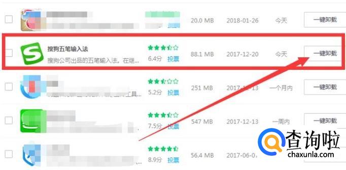 在弹出的页面中,我们找到搜狗输入法,点击右边的“一键卸载”,然后等待卸载完成就可以了。