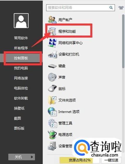 我们可以先点击小风车图标后,然后点击“控制面板”,选择“程序与功能”。
