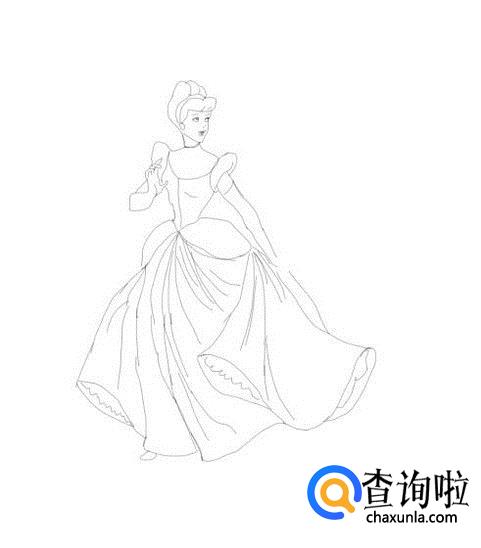 在画好的额头不下面画出公主漂亮的裙子,然后再画出公主的两只胳膊及手部,如图所示: