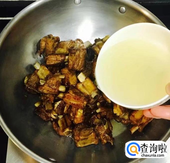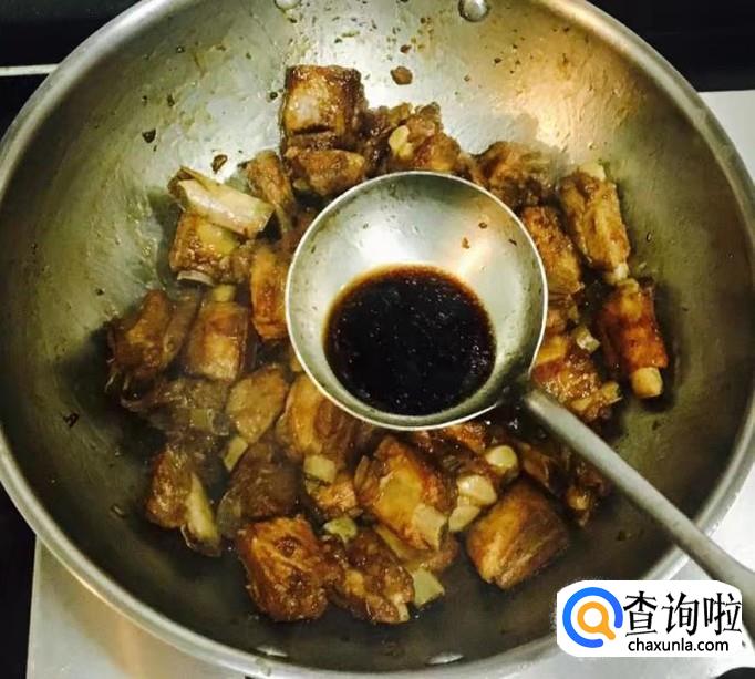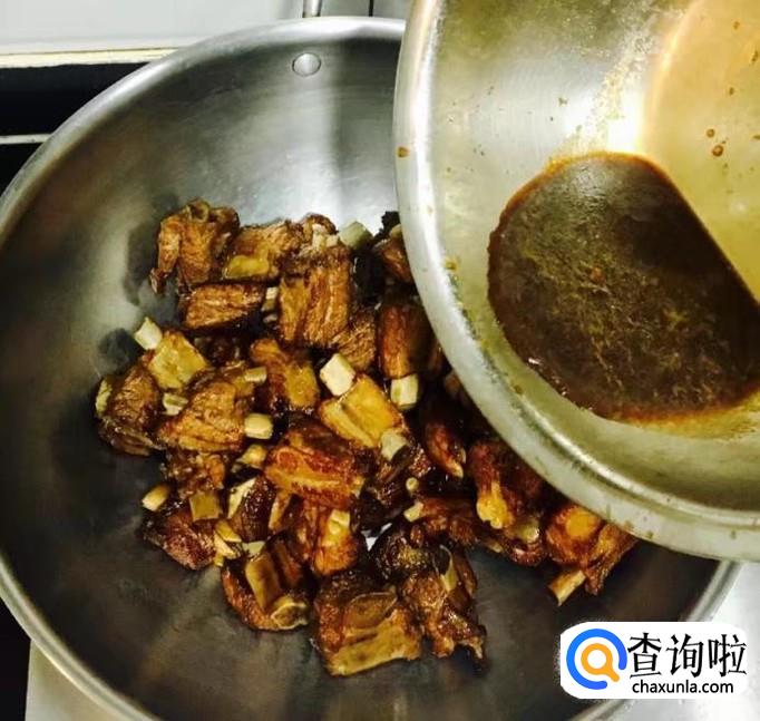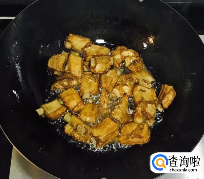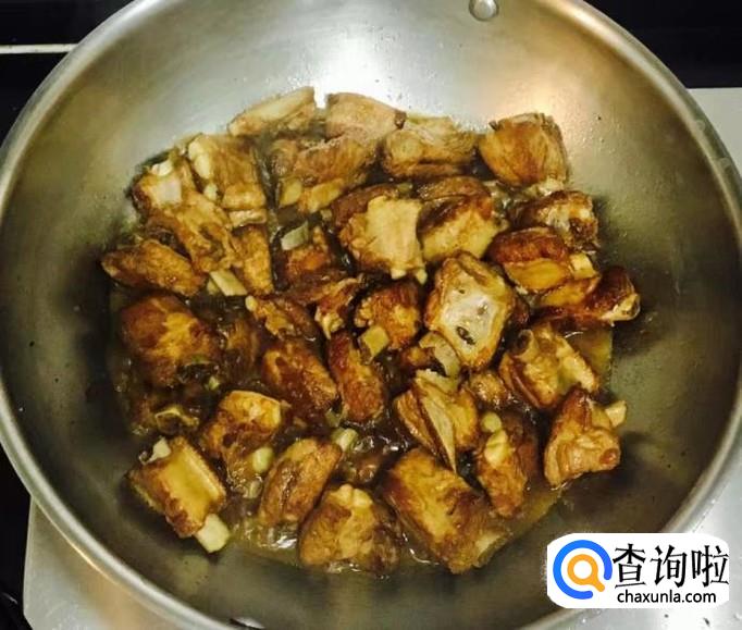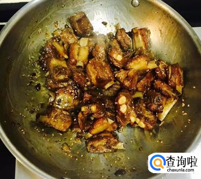 另取一口锅放入煎好的排骨和腌排骨时的汤汁,再倒入适量的排骨汤中火翻炒使排骨充分吸收汤汁
