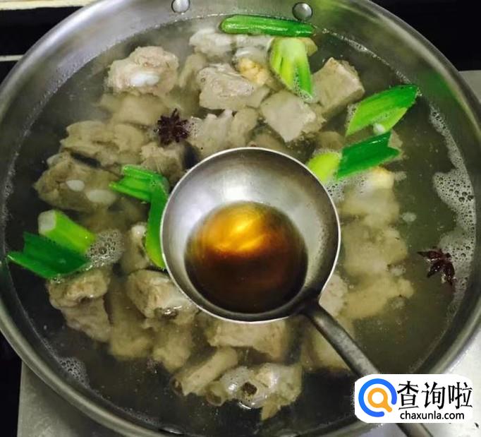 把焯过水的排骨重新放入锅中加入葱、姜、八角、花椒、香叶、料酒、白醋大火煮沸改中火炖煮30分钟左右关火
