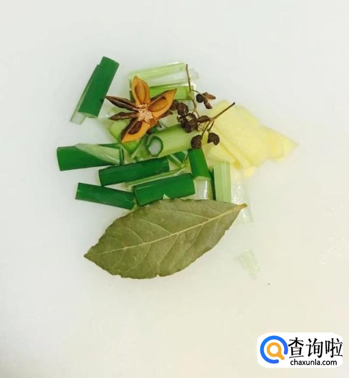 葱、姜剥去外皮清洗干净分别切成葱段、姜片,八角、花椒、香叶冲洗干净备用