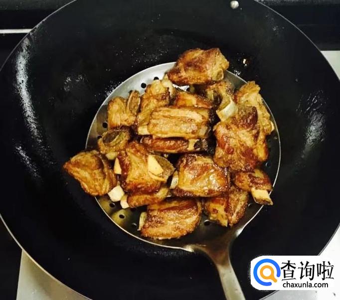 锅中加入适量的花生油,把腌制好的排骨控干汤汁后放入锅中煎至两面金黄捞出沥干油备用