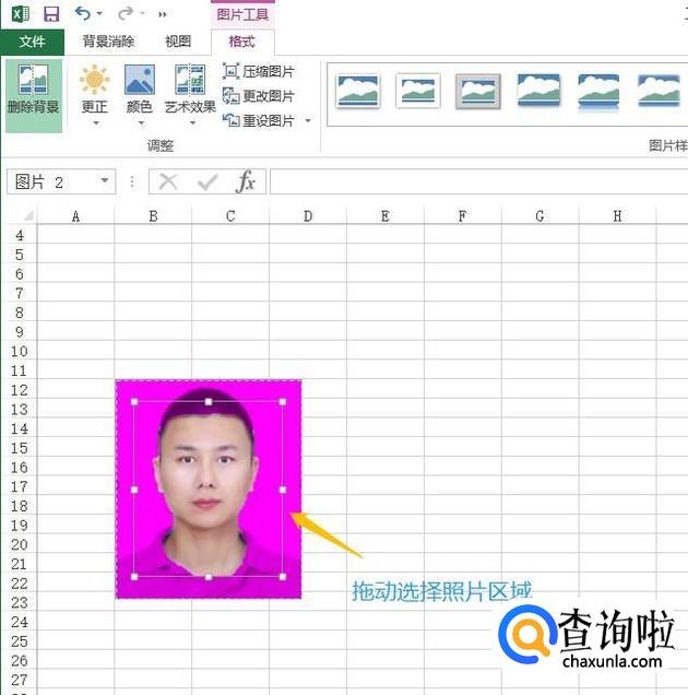 接着以上步骤,点击了图片格式工具以后,表格的左上角会出现一项"删除背景",点击这里之前的照片背景色就变成了紫红色,如图所示...